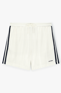 Your new favourite pair of 90s-inspired weekend shorts, with a deboss Futsol pinstripe, embroidered wordmark, and Japanese-crafted cotton stretch seam tape navy and white side stripes. Silky Rodier fabric. Side and back pockets. Made in Portugal. 100% recycled materials.