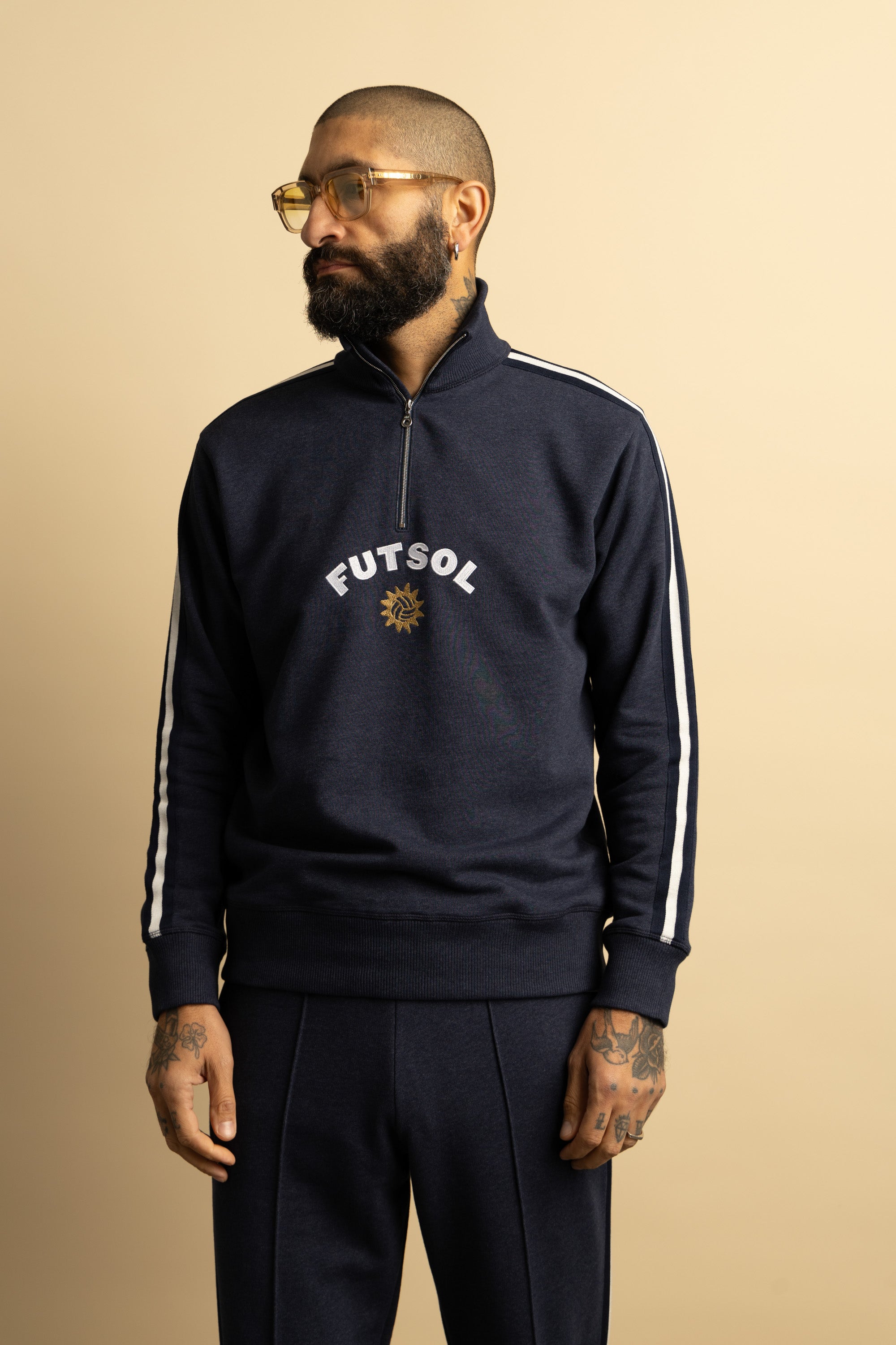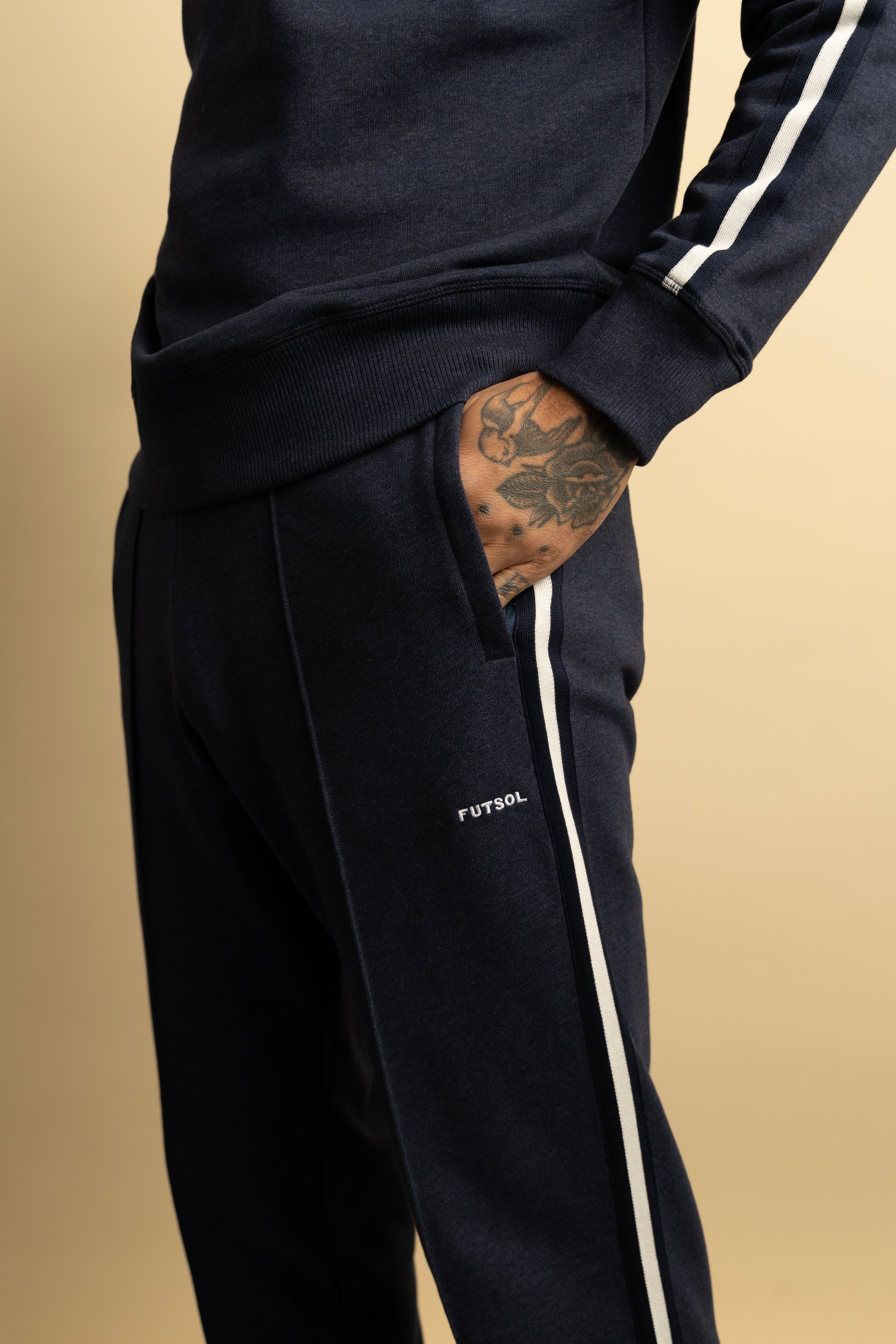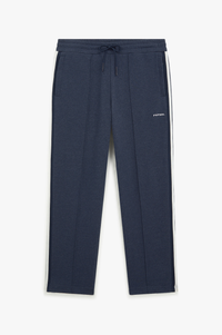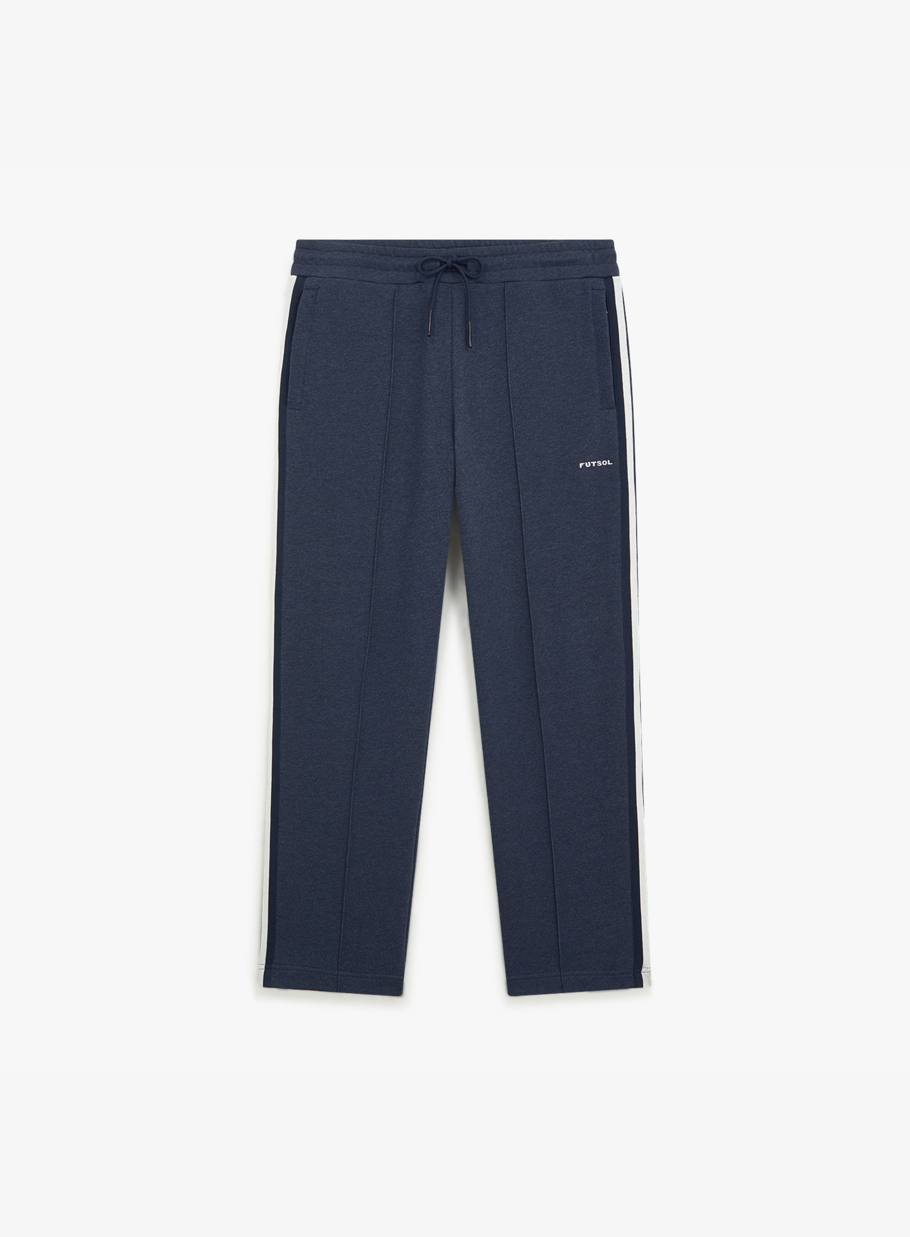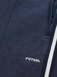 Crafted from a super-soft 100% French terry cotton marl knitted fabric, blending two coloured yarns, these navy pants are inspired by a 1960s Brazil tracksuit sported by Pele and his teammates (styled with smart leather shoes, no less). A subtle, embroidered Futsol insignia is stitched on the upper left leg. Finished with a Japanese-made knit tape strip down the length of the leg.