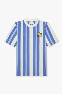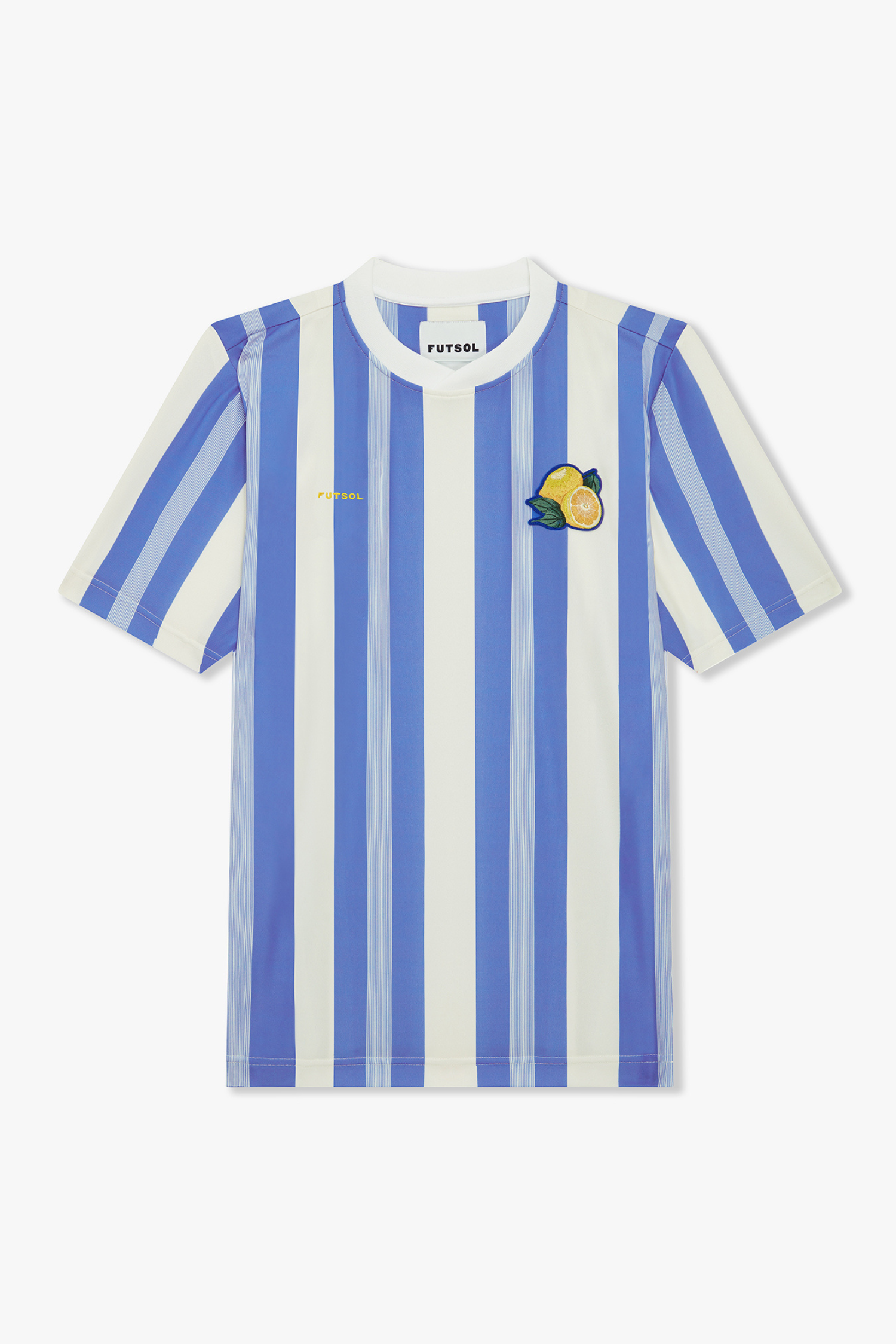 An off-white and blue striped short-sleeve jersey with pinstripe detailing, garnished with a beautifully detailed embroidered lemon crest. A perfect number for your mid-week kickabouts (or for tucking into a pair of jeans at the weekend). Manufactured in limited runs of 100 units in Portugal using recycled polyester from post-consumer plastic bottles.