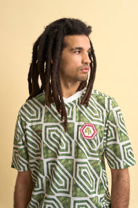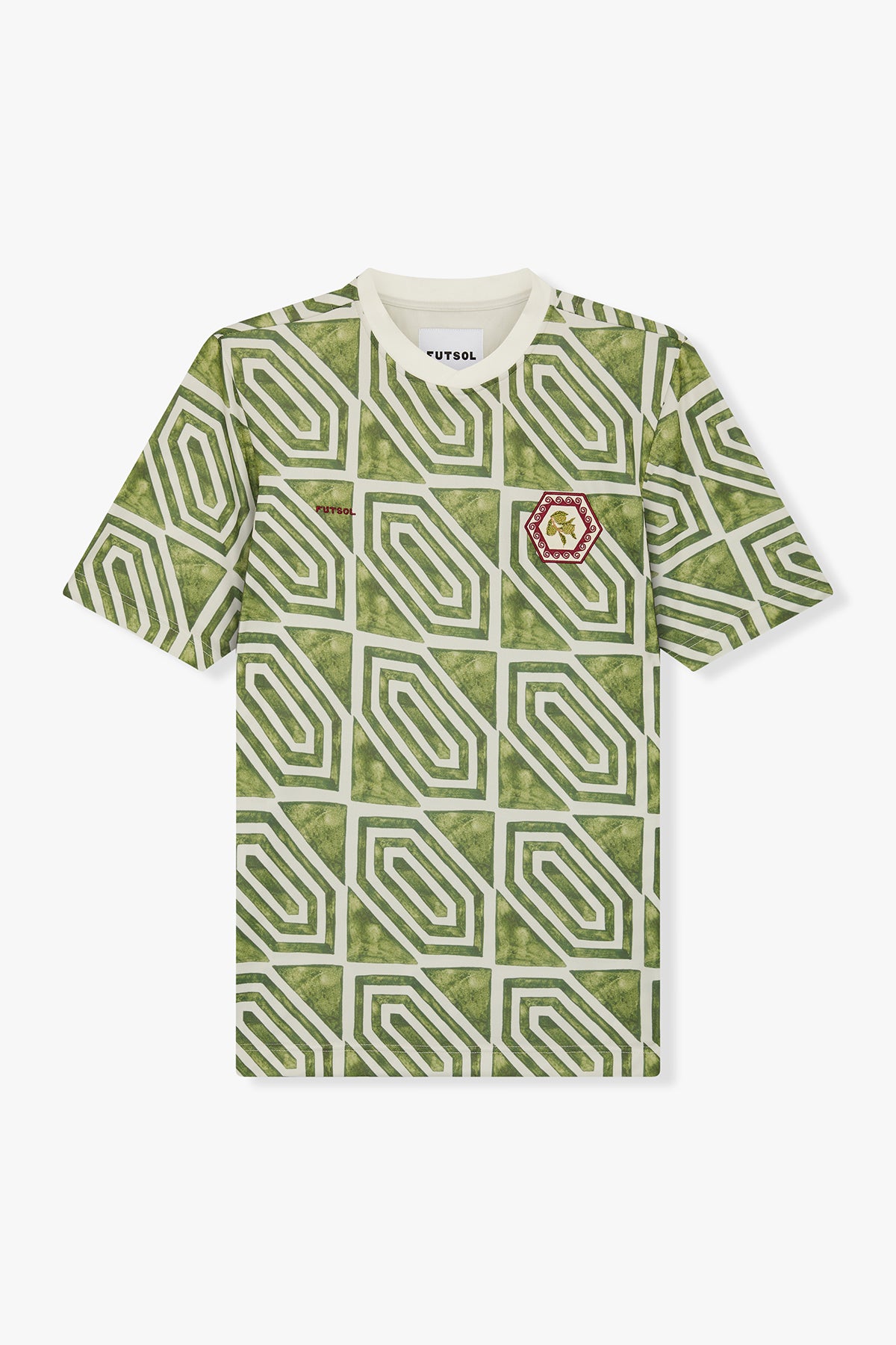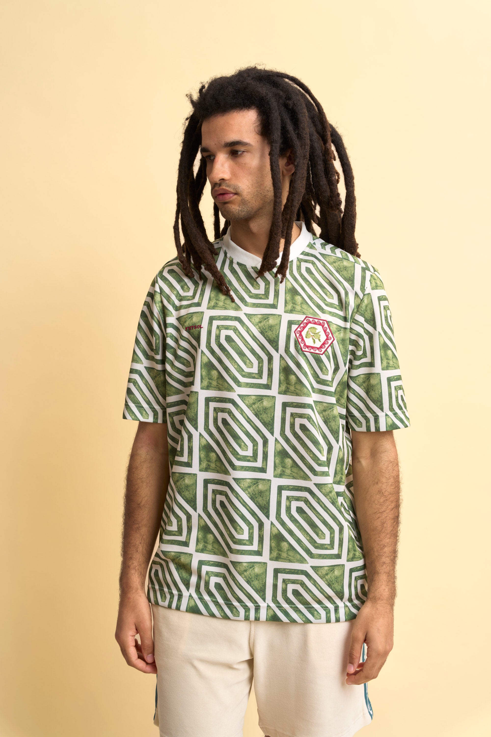 Some see a repeat pattern of the mosaic seen on the floor of the ancient Villa Romana del Casale in Piazza Armerina - a fascinating football-loving Sicilian town which inspired this collection. Some see a rare Nigeria kit. Either way, this is rare. Wear the olive branch embroidered badge with pride.