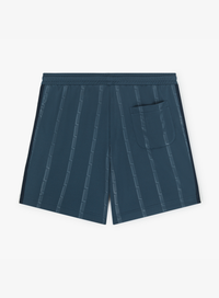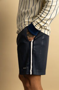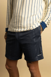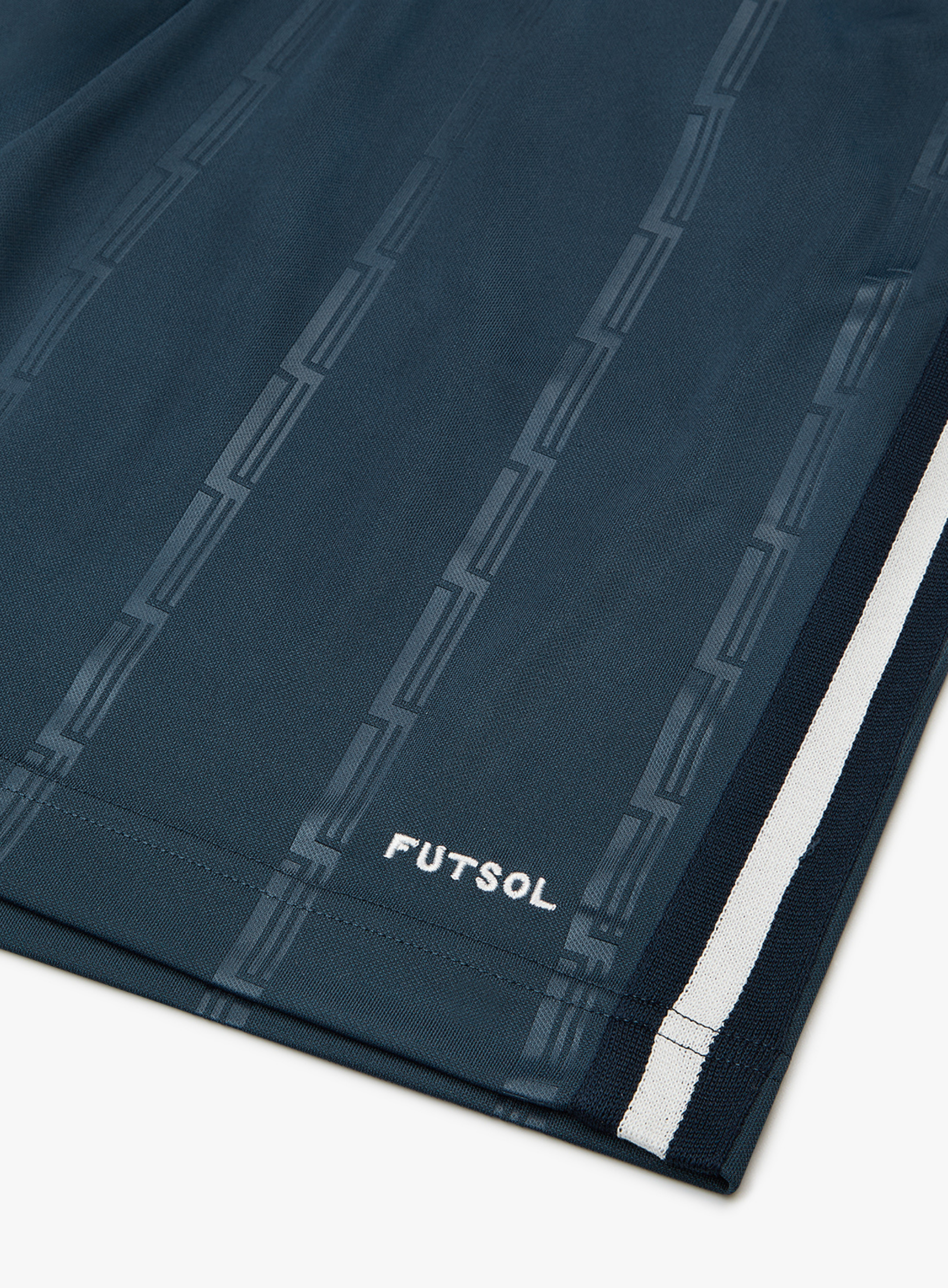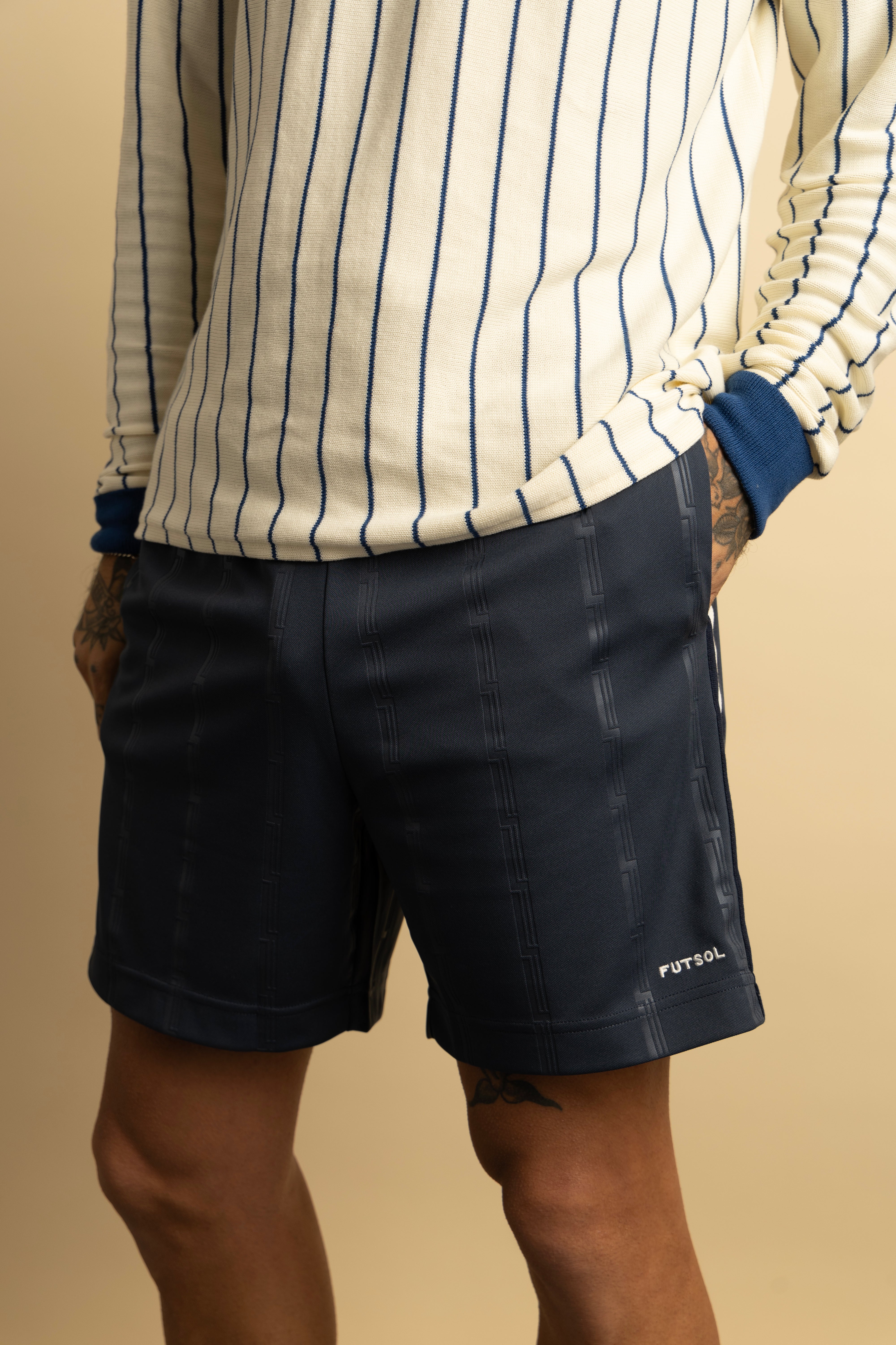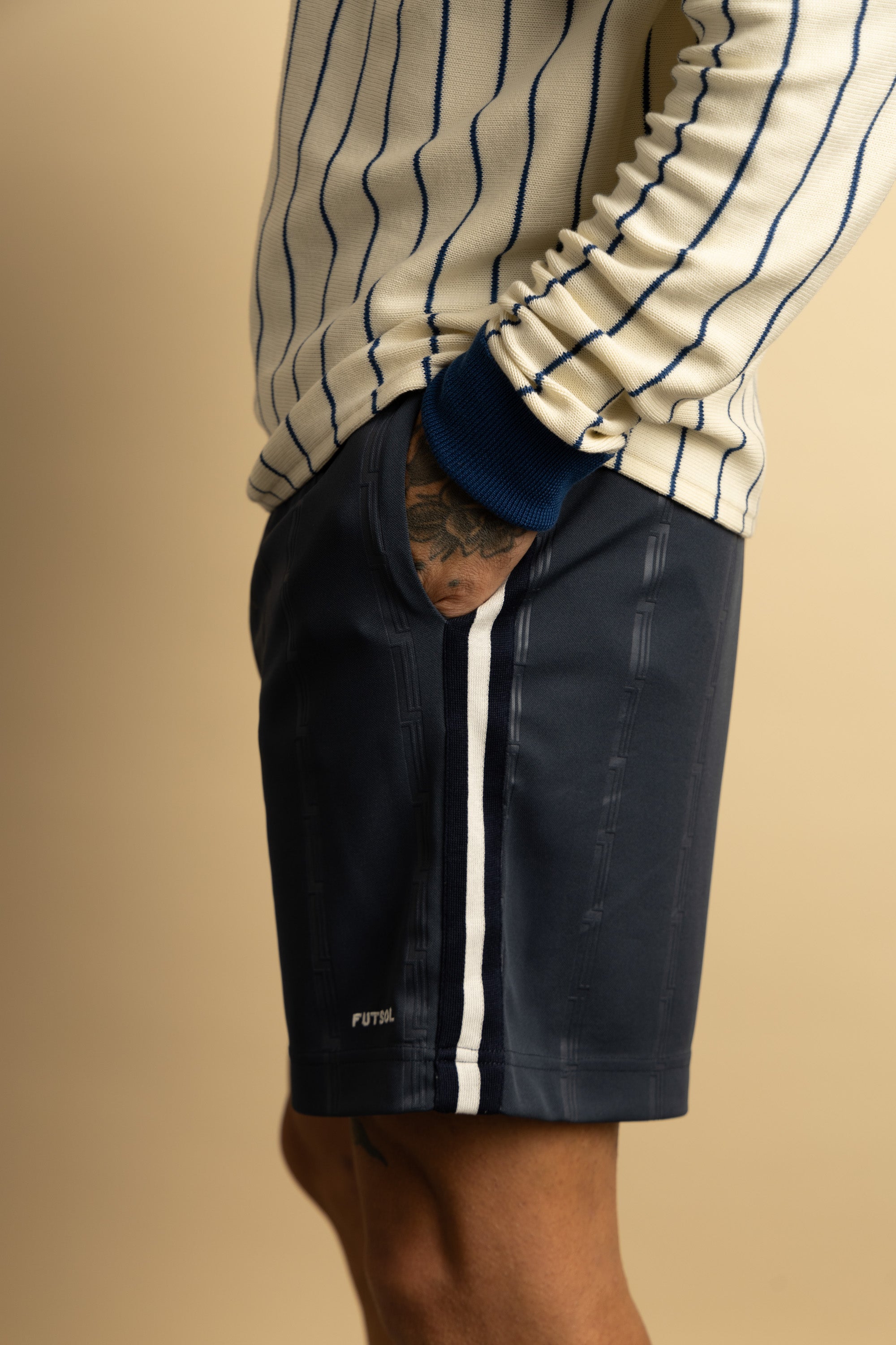 Your new favourite pair of 90s-inspired weekend shorts, with a deboss Futsol pinstripe, embroidered wordmark, and Japanese-crafted cotton stretch seam tape navy and white side stripes. Silky Rodier fabric. Made in Portugal. 100% recycled materials.
