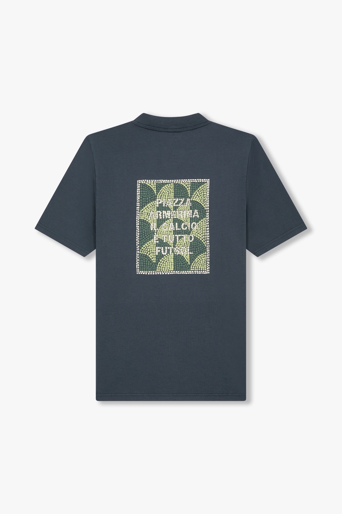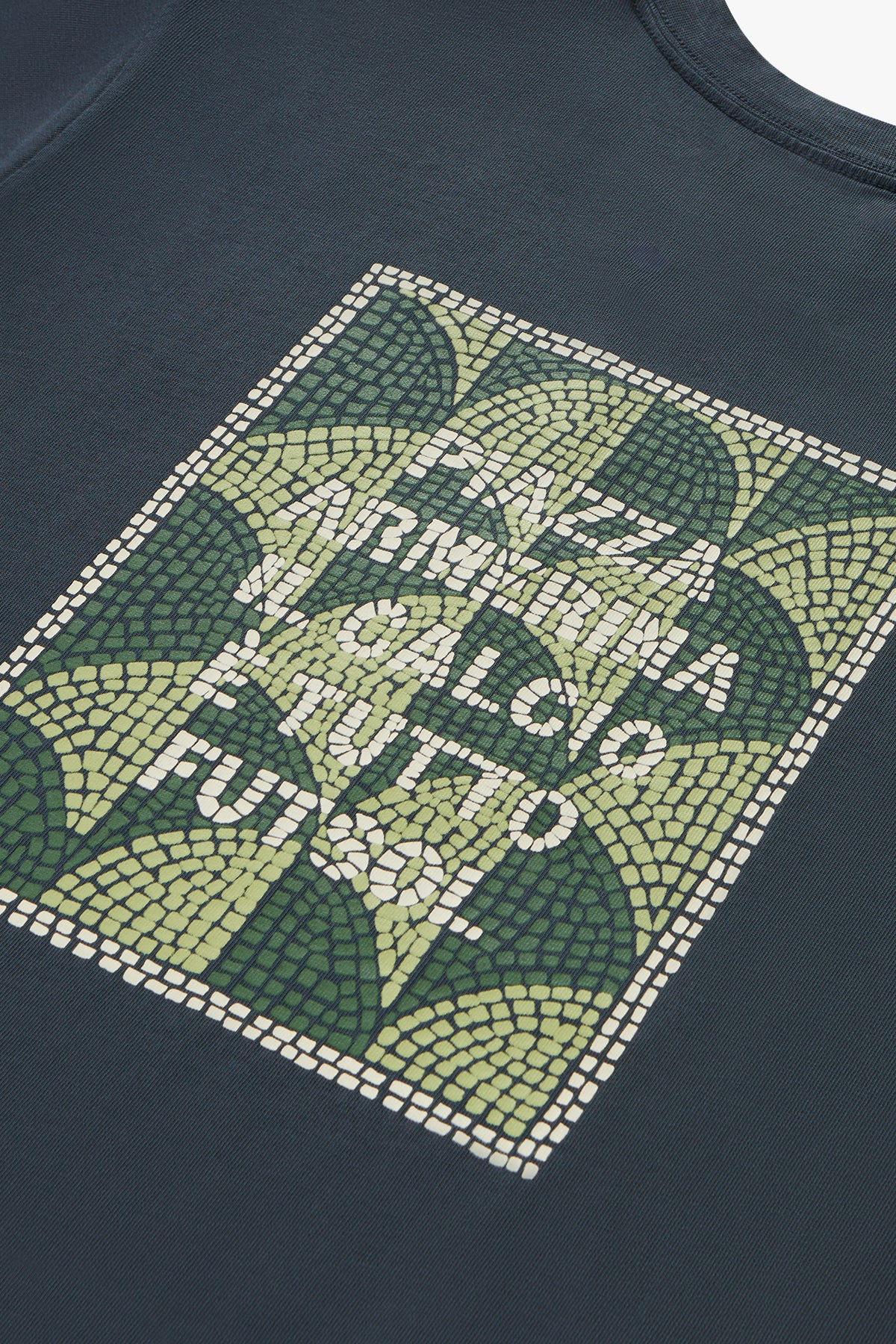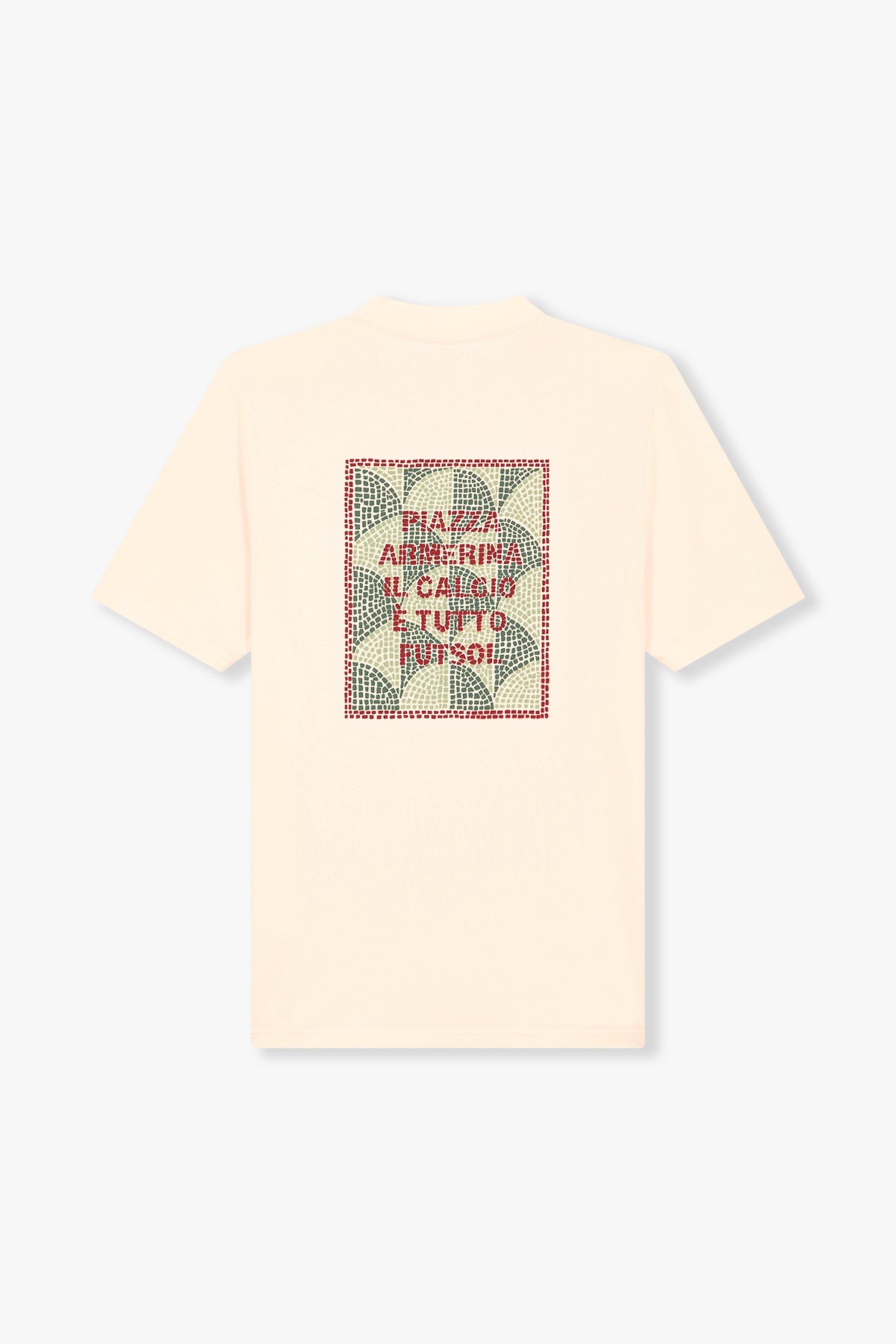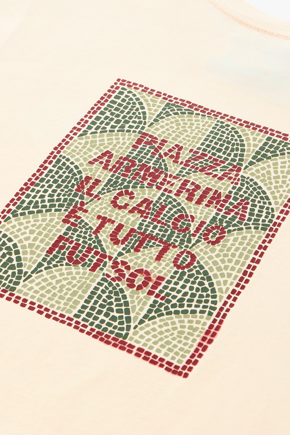A summer-ready graphic Tee with a Sicilian love letter on the back – to the beautiful game, to heritage artistry, to Piazza Armerina. Hand-painted by our resident artist Christian, the intricate mosaic design is inspired by the ancient Roman villa found in this football-loving community.