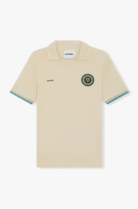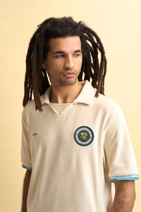 We took a daydream of a 60s football shirt and added a green laurel and olive crest, inspired by Piazza Armerina - a Sicilian town we visited before creating our this collection. It’s crafted in fine cream velour which makes us think of Sean Connery, it makes us think of the beach, and it makes us think of summer. Good.