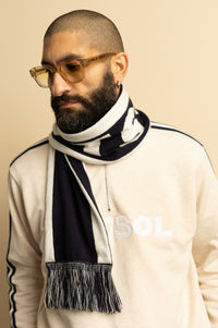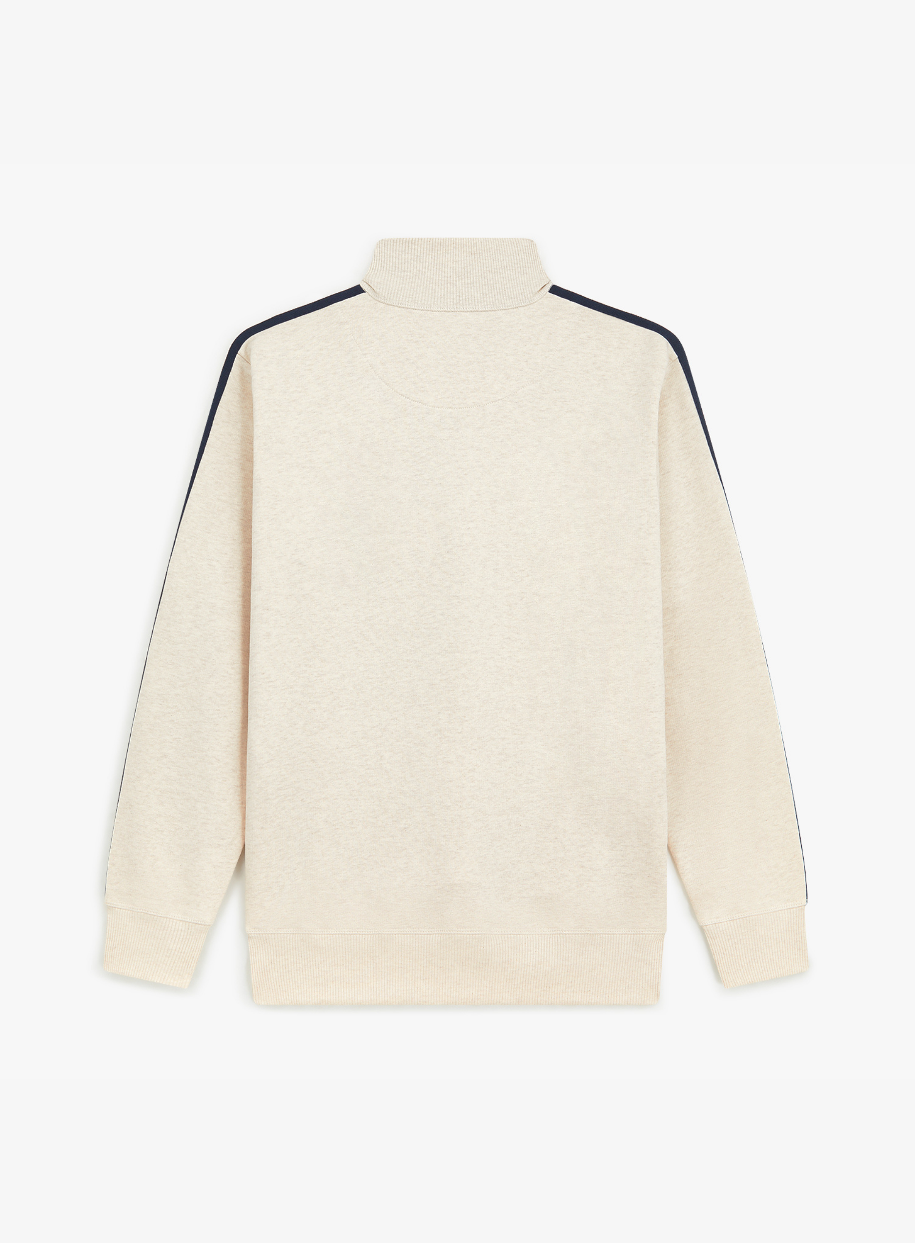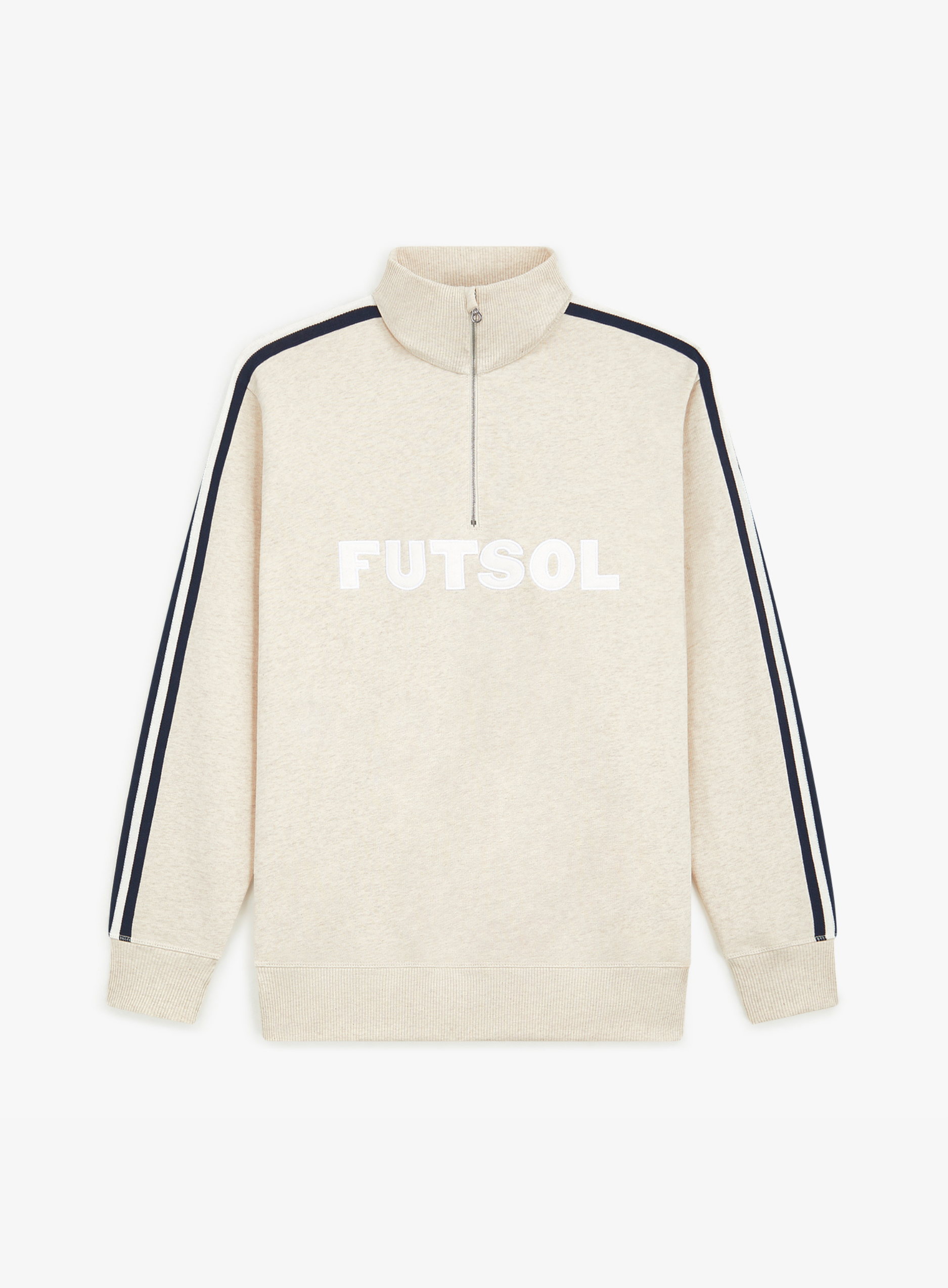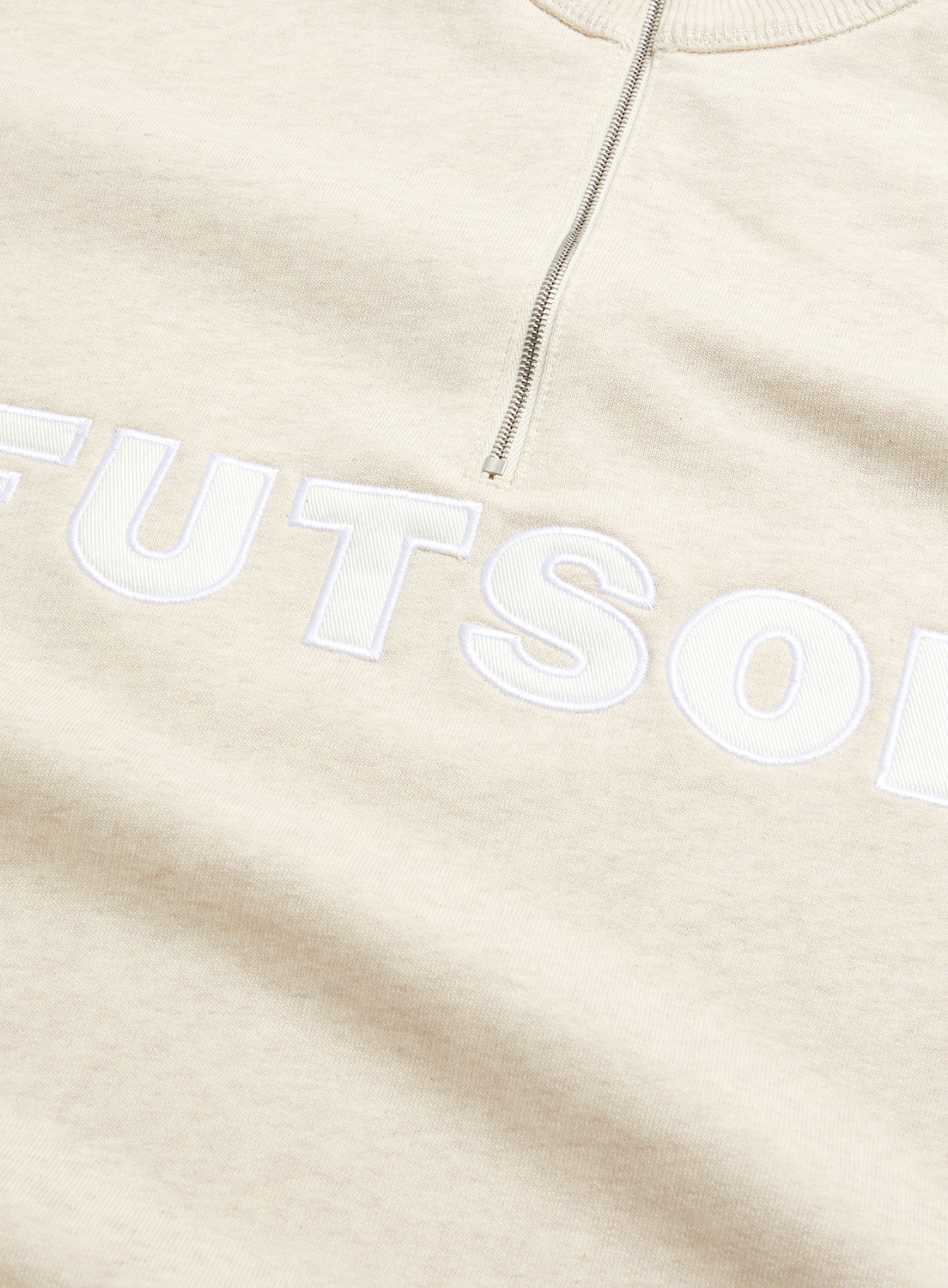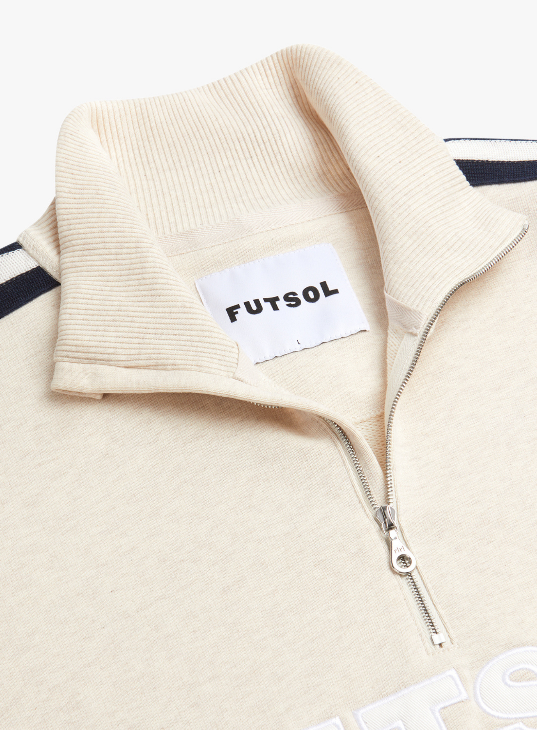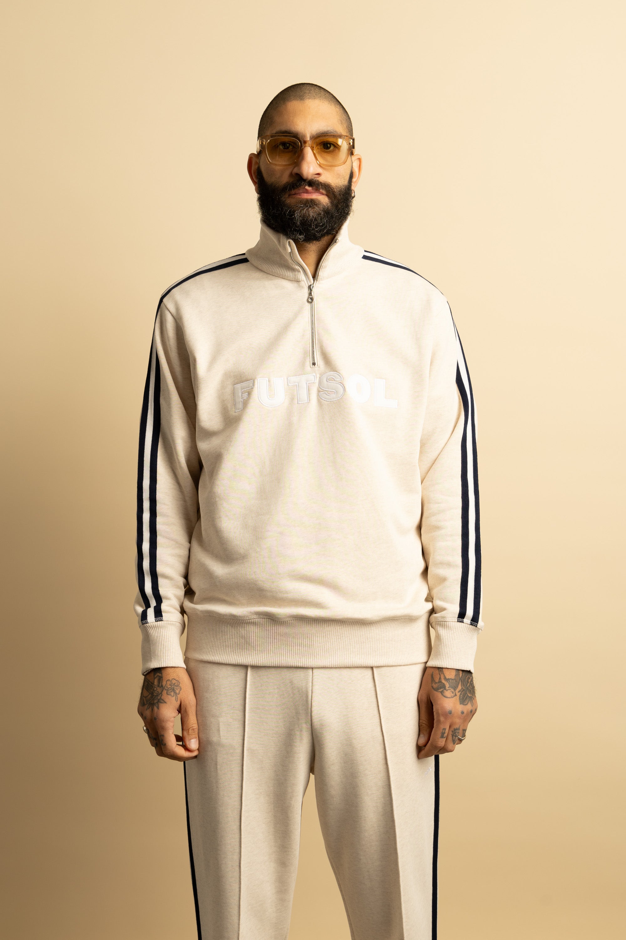 Crafted in Portugal from a super-soft 100% French terry cotton marl knitted fabric, blending two coloured yarns, this ecru top is inspired by a 1960s Brazil tracksuit sported by Pele and his teammates (styled with smart leather shoes, no less). It features a raised, embroidered Futsol insignia and a Riri quarter zipper. Finished with a Japanese-made knit tape strip down the length of the arm.