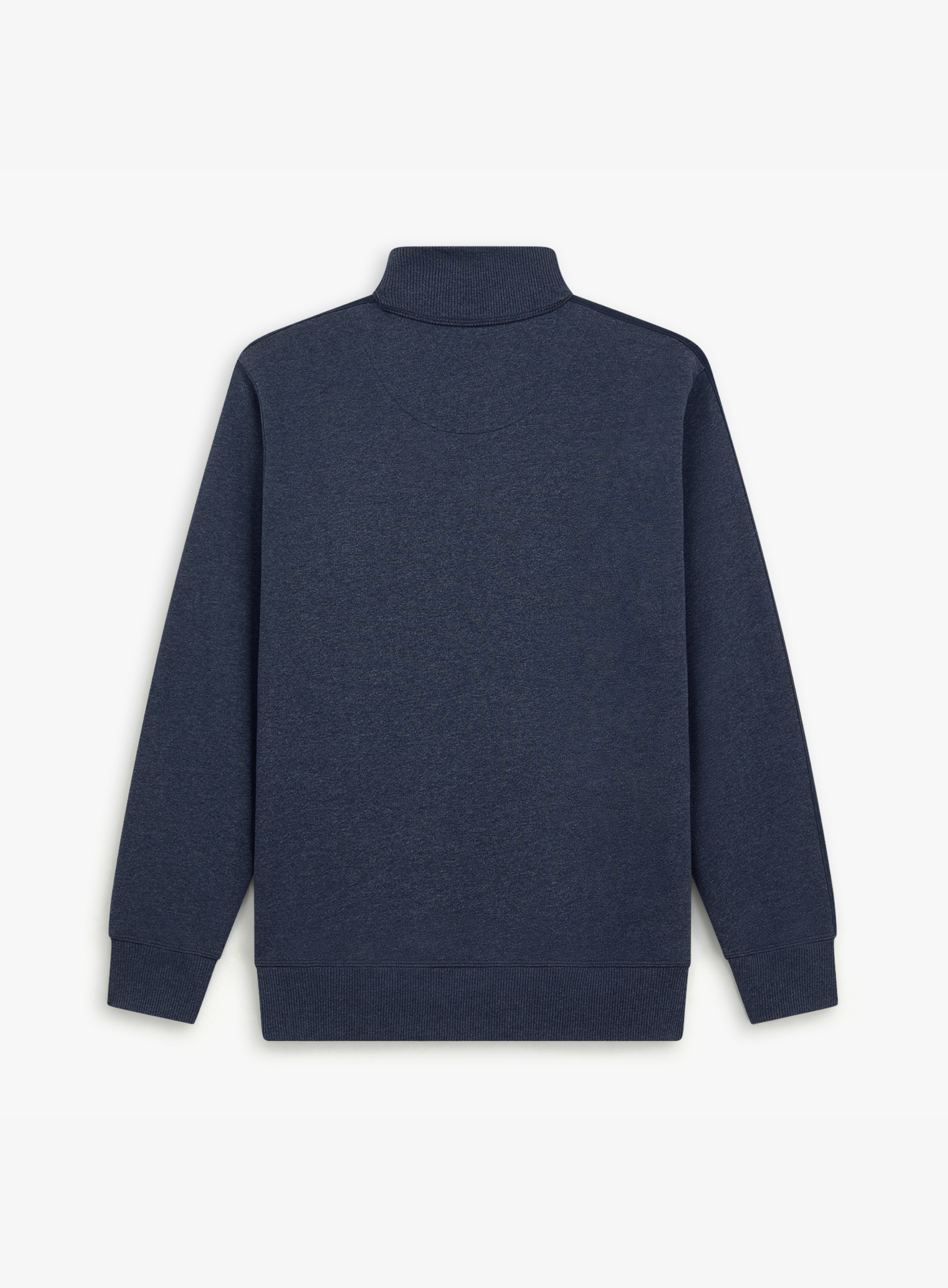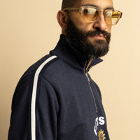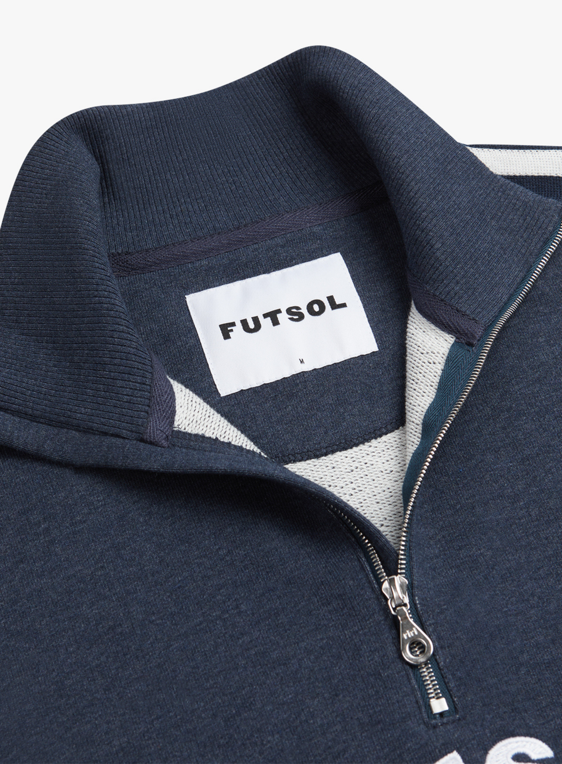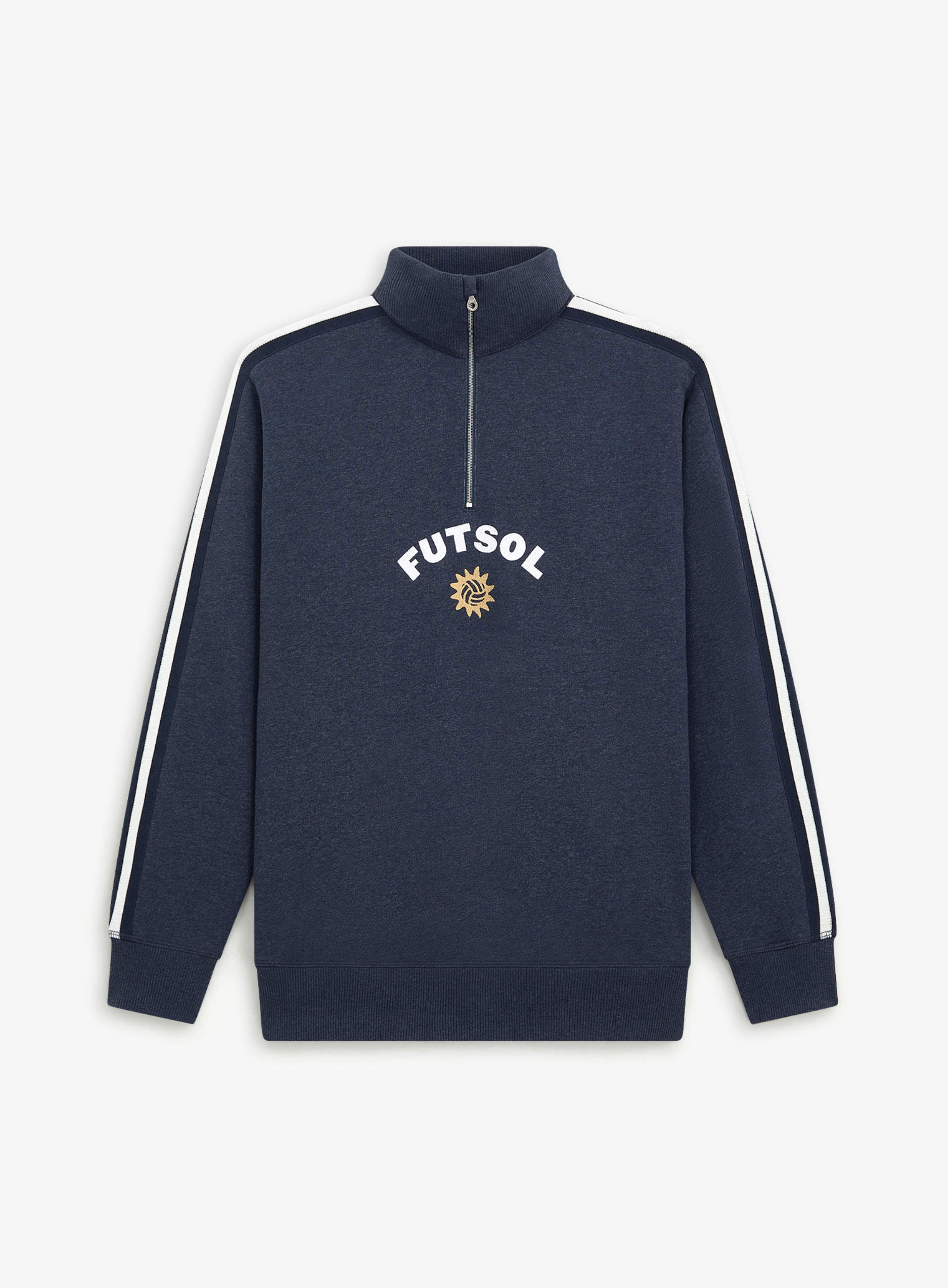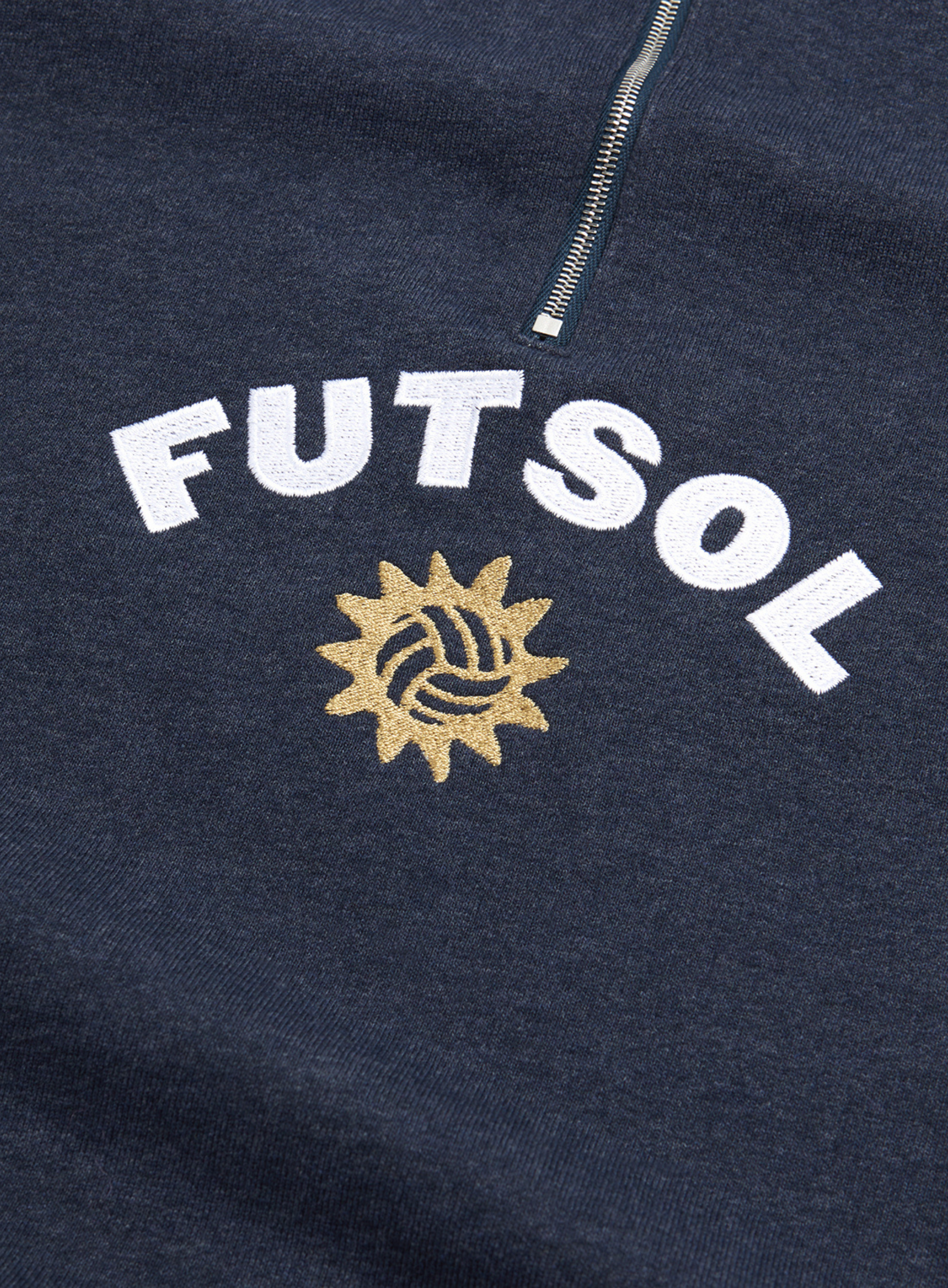 Crafted from a super-soft 100% French terry cotton marl knitted fabric, blending two coloured yarns, this navy warm-up top is inspired by a 1960s Brazil tracksuit sported by Pele and his teammates (styled with smart leather shoes, no less). It features a raised, embroidered Futsol and sunball insignia, and a Riri quarter zipper. Finished with a Japanese-made knit tape strip down the length of the arm.