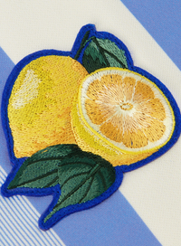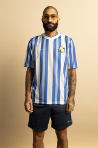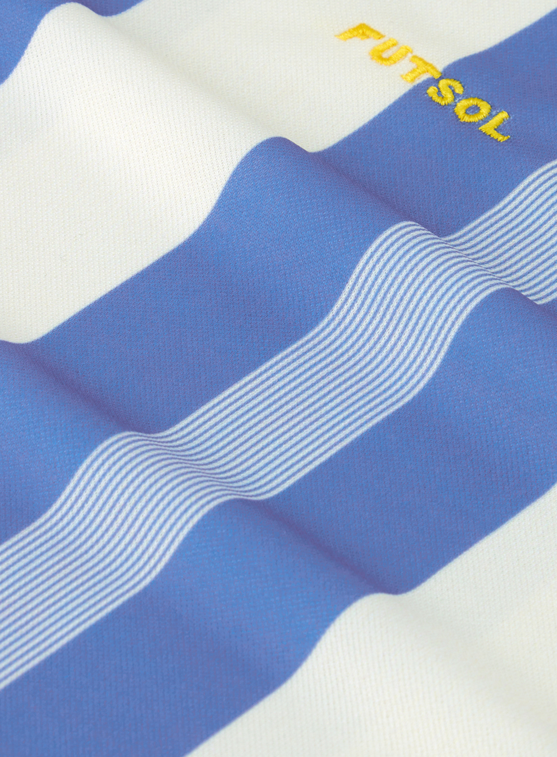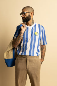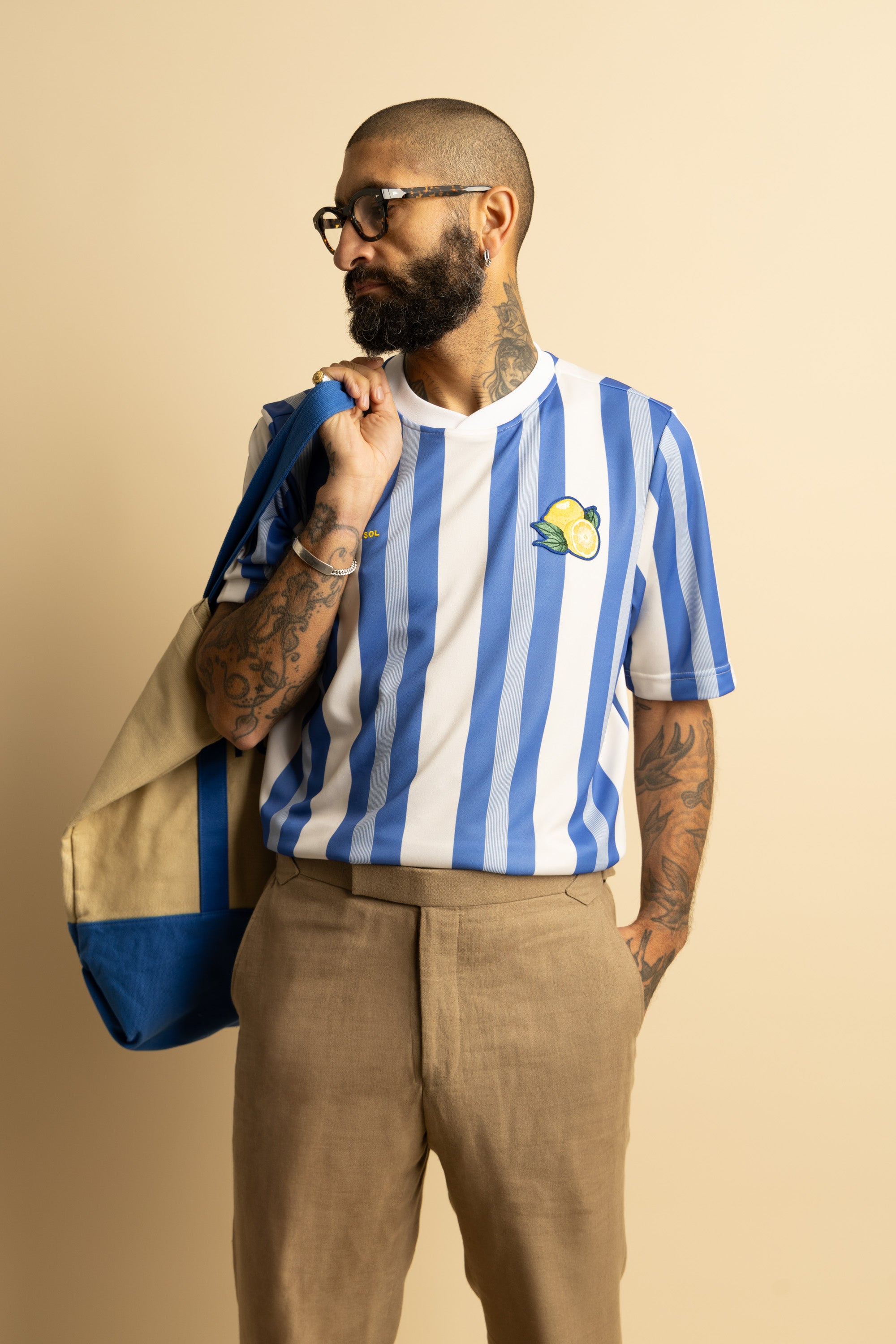 An off-white and blue striped short-sleeve jersey with pinstripe detailing, garnished with a beautifully detailed embroidered lemon crest. A perfect number for your mid-week kickabouts (or for tucking into a pair of jeans at the weekend). Manufactured in limited runs of 100 units in Portugal using recycled polyester from post-consumer plastic bottles.