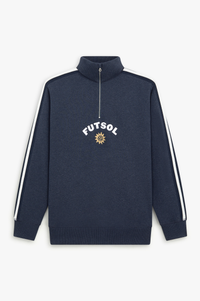 Crafted from a super-soft 100% French terry cotton marl knitted fabric, blending two coloured yarns, this navy warm-up top is inspired by a 1960s Brazil tracksuit sported by Pele and his teammates (styled with smart leather shoes, no less). It features a raised, embroidered Futsol and sunball insignia, and a Riri quarter zipper. Finished with a Japanese-made knit tape strip down the length of the arm.