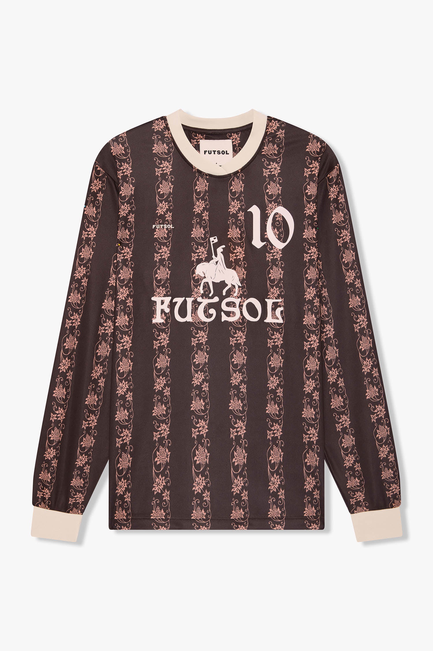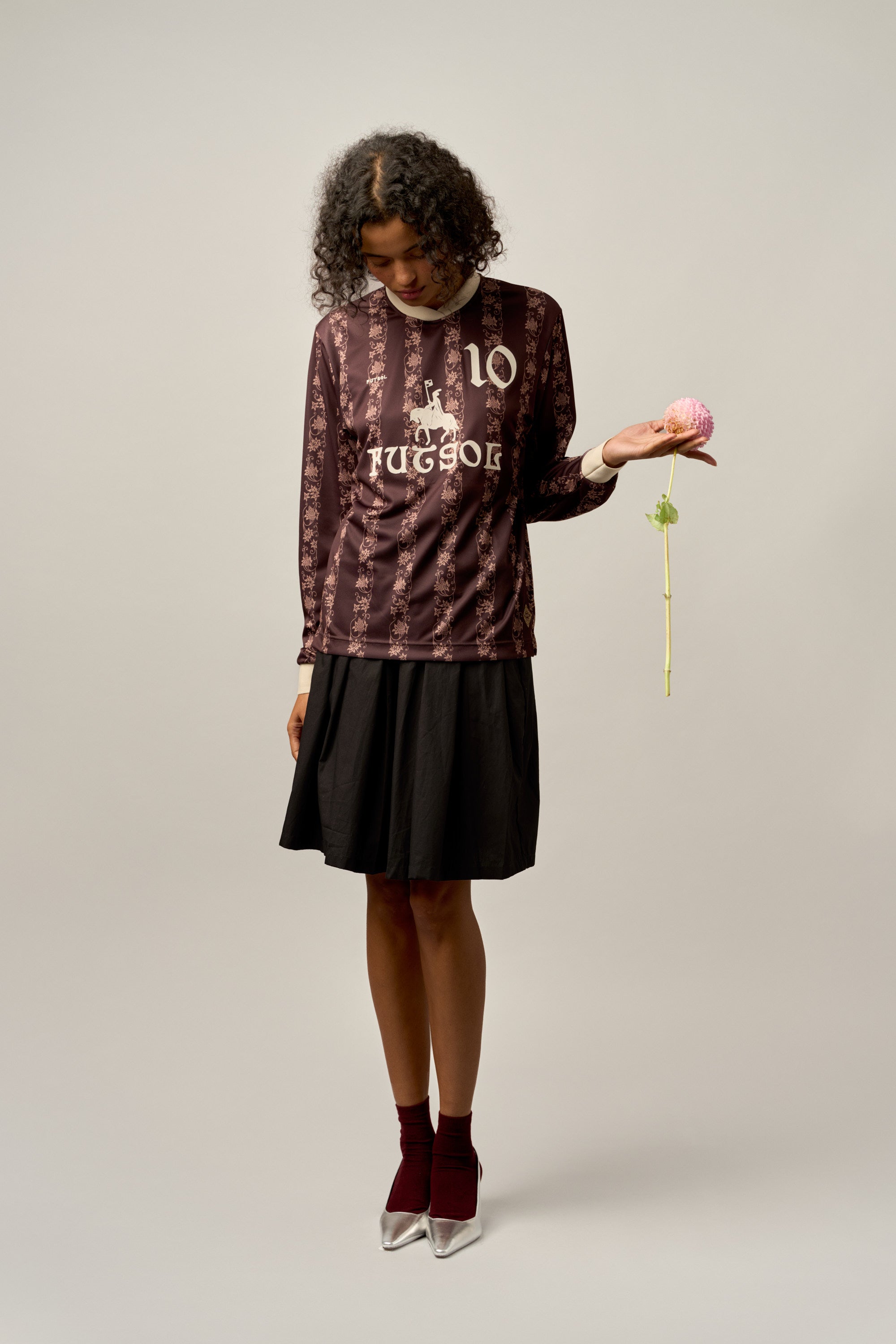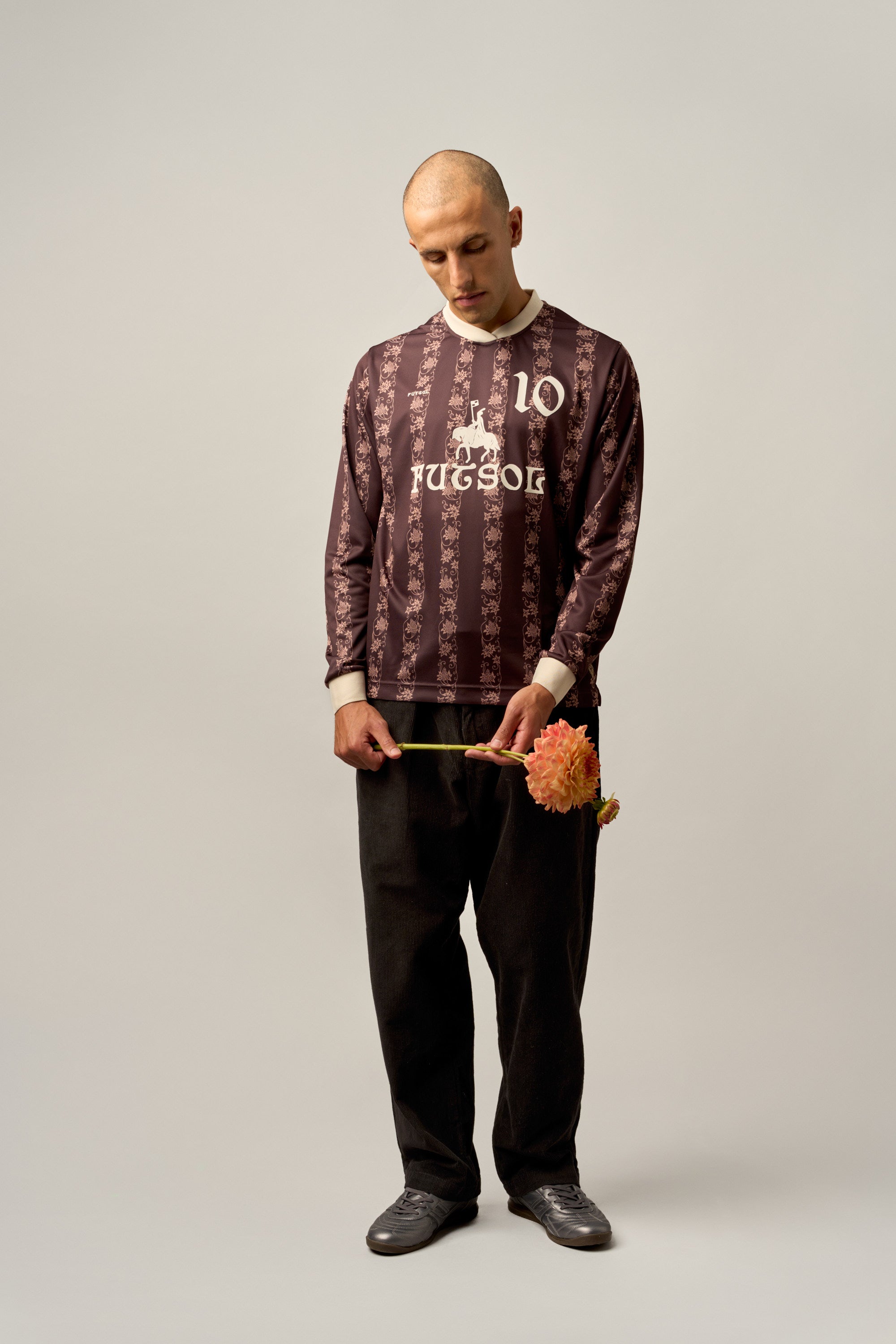 The ornate stripe motif, taken from the spines and borders of ancient bucolic British book covers, is a repeat symbol of this collection, and adorns this crewneck with football stripes more intricate than your average Dog And Duck team. A large centre crest is crafted from an ancient folkloric horse (proudly carrying a corner flag, of course). It all nods to the feel of this season – a celebration of the great outdoors, a tribute to the ancient, mythical traditions that shaped the beautiful game.