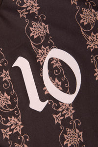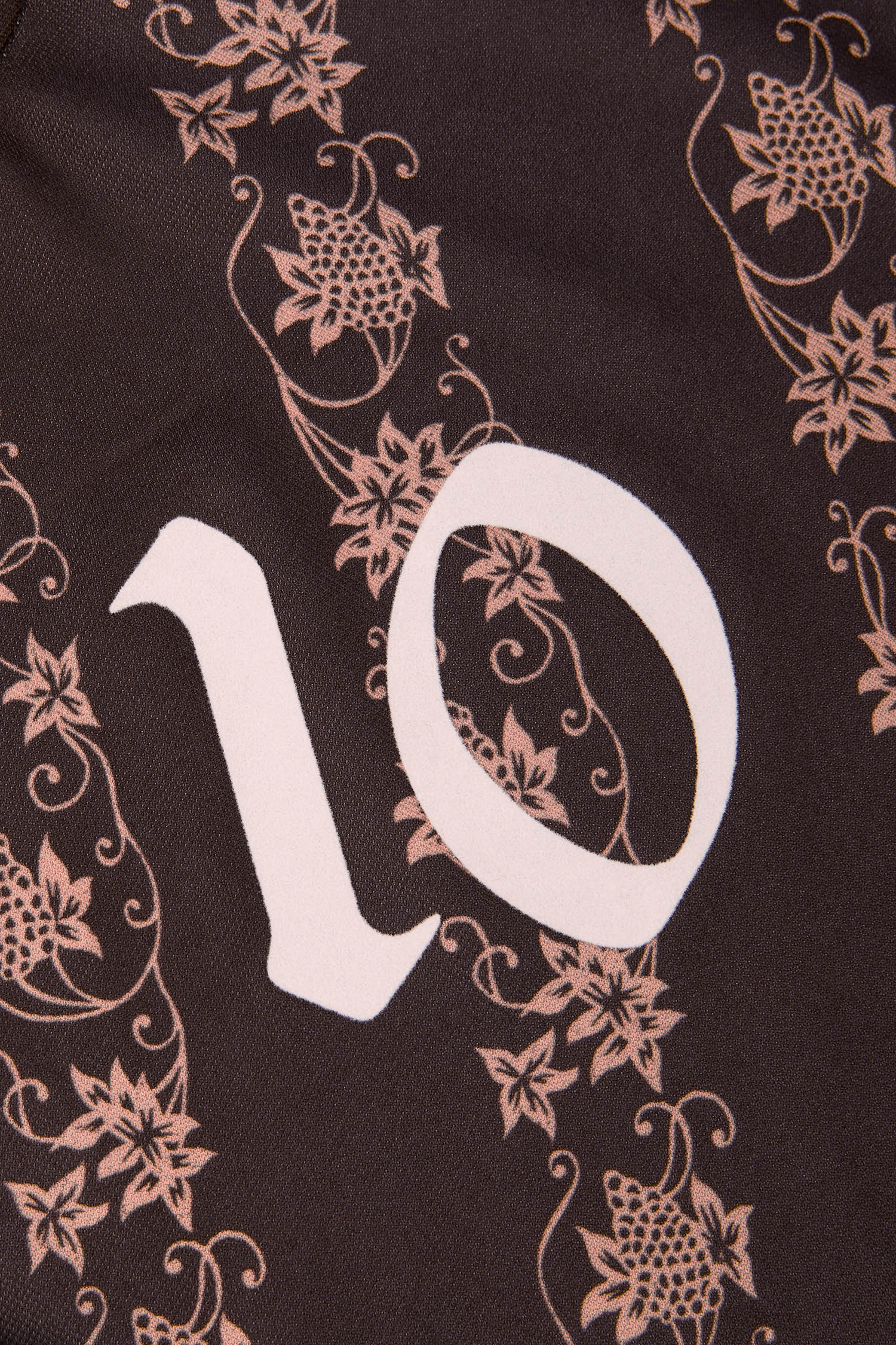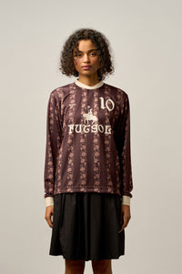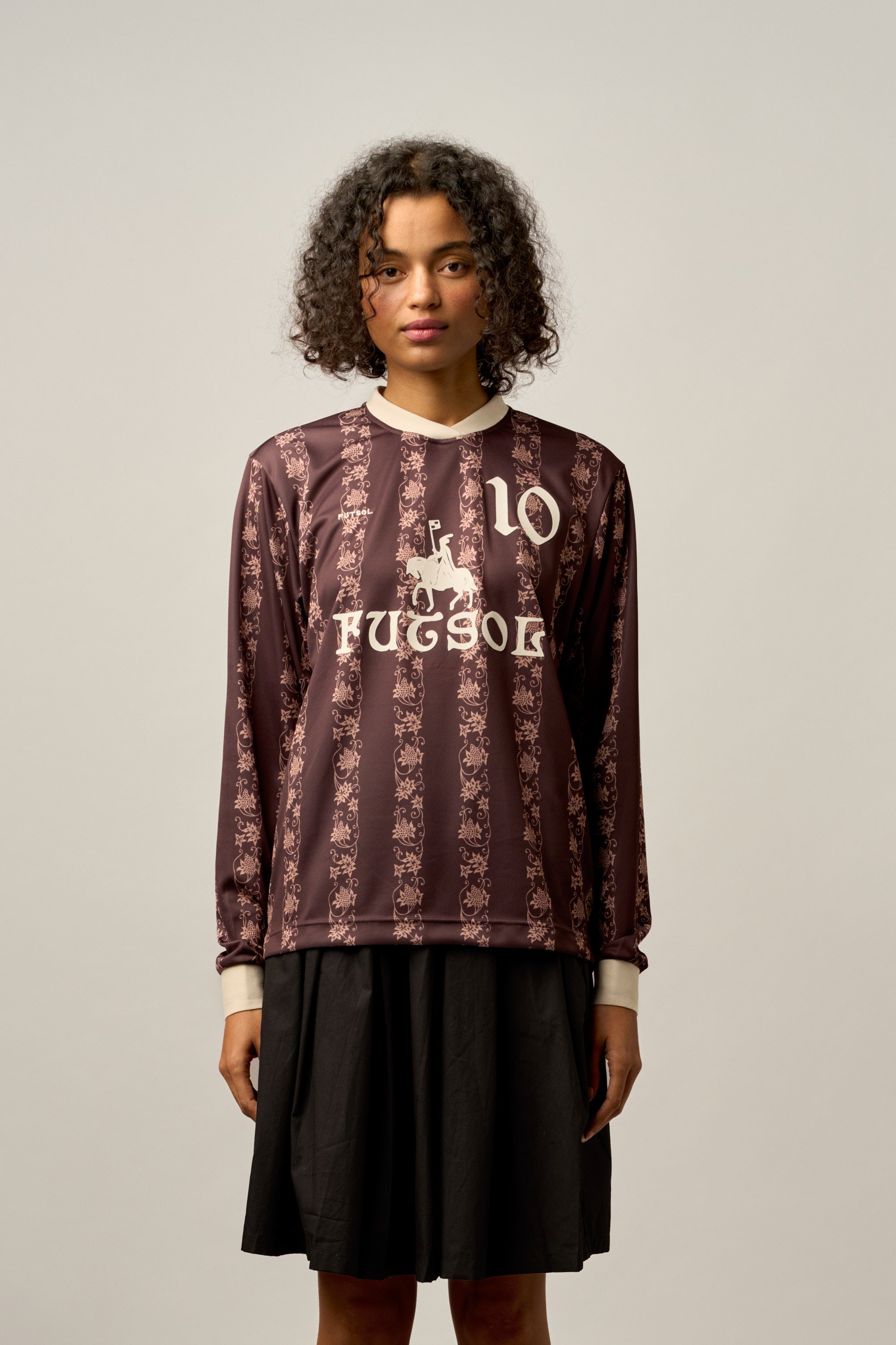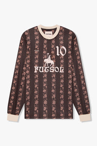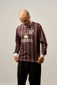 The ornate stripe motif, taken from the spines and borders of ancient bucolic British book covers, is a repeat symbol of this collection, and adorns this crewneck with football stripes more intricate than your average Dog And Duck team. A large centre crest is crafted from an ancient folkloric horse (proudly carrying a corner flag, of course). It all nods to the feel of this season – a celebration of the great outdoors, a tribute to the ancient, mythical traditions that shaped the beautiful game.